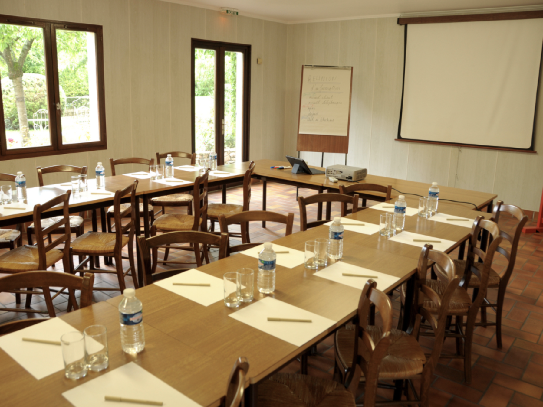 Nous mettons à votre disposition une salle indépendante équipée d'un vidéoprojecteur avec écran de projection, d'un paperboard, d'un tableau blanc, d'un accès Wi-fi gratuit.